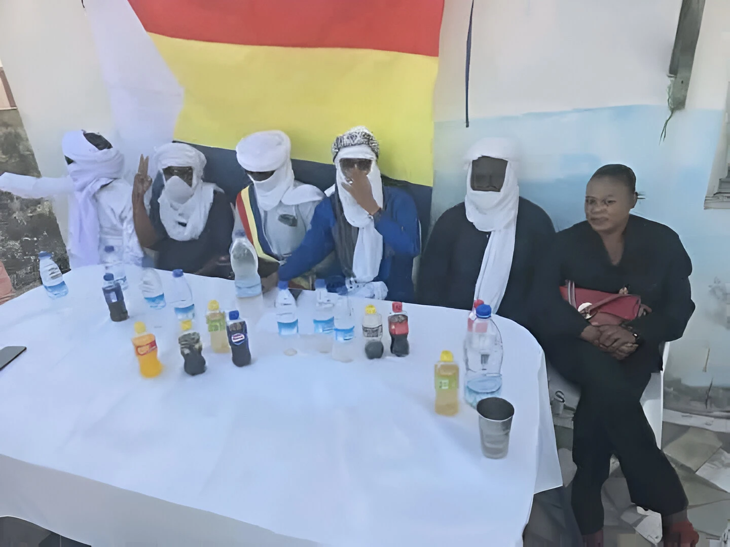 La vidéo publiée sur les réseaux sociaux, notamment TikTok et Facebook, présente un groupe d’hommes entièrement voilés, vêtus comme des membres de communautés touarègues (tenues traditionnelles sahéliennes), assis autour d’une table sur laquelle sont disposées des boissons et des bouteilles d’eau. Une femme non voilée est également présente à la table.