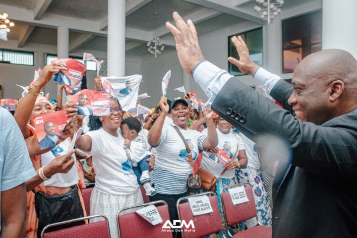 De façon plus précise, il égrène : « Nous allons financer vos activités, vos commerces. Il y aura des emplois pour toutes les femmes. Pour les mamans, nous allons construire des crèches pour vos enfants. Les femmes au foyer auront un salaire grâce à un soutien financier. Nous allons donner des bourses d’études à celles qui vont à l’école. Nous allons instaurer une brigade pour lutter contre les harcèlements sexuels. Cet ensemble de politique de valorisation de la femme, Ahoua Don Mello sait faire ».