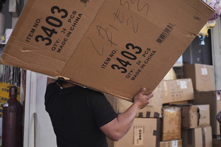 Une personne porte sur son épaule une boîte en carton sur laquelle est inscrit « Fabriqué en Chine »